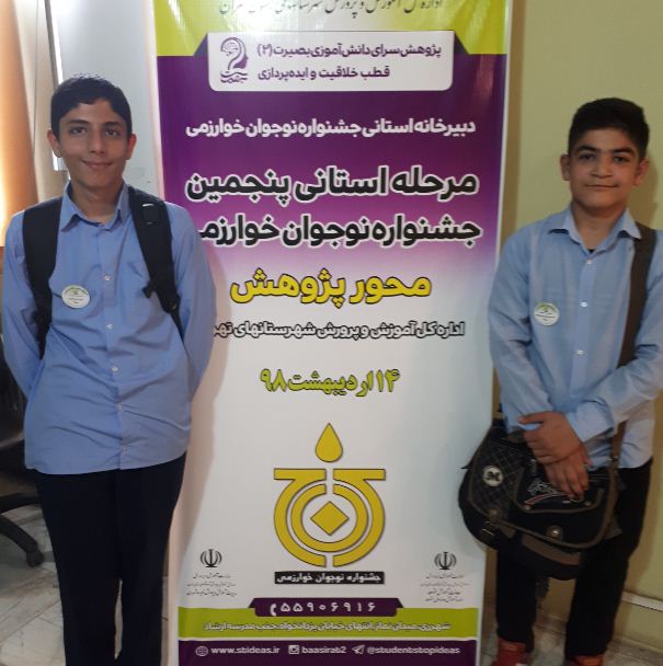 دوستان خوبم آقایان نوعی و خسروزاده ، ارایه عالی شما در مرحله استانی پژوهش نوجوان خوارزمی را تبریک می گویم و از خداوند بزرگ برای شما عالی ترین ها را آرزومندم. کار شما ، قدرت بیان و ارایه دقیق و درست شما در مرحله استانی و در حضور دانش آموزان استان و داوران استانی بسیار عالی بود. از این که در این مدت تلاش نمودید از شما سپاسگزارم. امیدورام حضور در این مسابقات علمی در سایر مقاطع تحصیلی شما ادامه دار باشد که شما نشان دادید توانایی انجام امور پژوهشی را دارید و مطابق نظر داوران نوآوری و دقت شما در موضوع پژوهشی ، قدرت بیان شما در ارایه، مشارکت در فرایند کارگروهی و در انجام پژوهش شایسته احترام می باشد.
